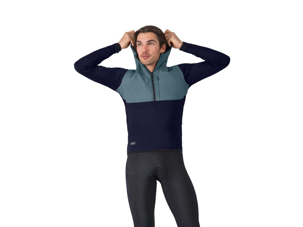 Mikina Castelli Unlimited Roam Hoodie určená na bicykel aj mimo bicykla, teplá flísová mikina s nylonovým prekrytím na hrudi a s kapucňou.
